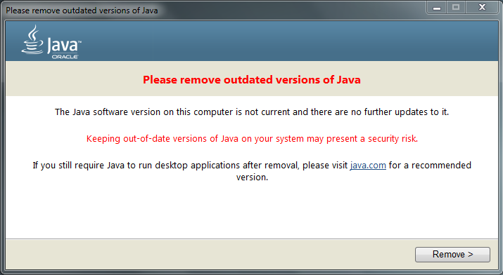 На вашем компьютере установлена не самая новая версия программного обеспечения Java, и вы получили это уведомление, потому что дополнительных обновлений для нее больше нет. Жизненный цикл JDK 10 закончился в сентябре 2018 года . Пользователям, установившим программное обеспечение JRE 9 и/или JRE 10 (выпуски без долгосрочной поддержки), следует удалить эти устаревшие версии Java. Использование устаревших версий Java в системе может представлять угрозу безопасности.