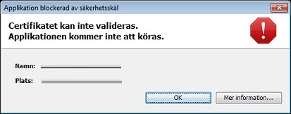 - Meddelande: Säkerhetsinställningarna har blockerat en applikation som har signerats med ett utgånget eller ännu inte giltigt certifikat från att köras
